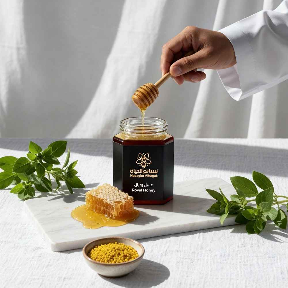 عسل رويال الملكي من نسائم الحياة هو مزيج نادر يجمع بين عسل السدر الجبلي النقي، الجينسنغ الكوري الأحمر الفاخر، وحبوب اللقاح الطبيعية.