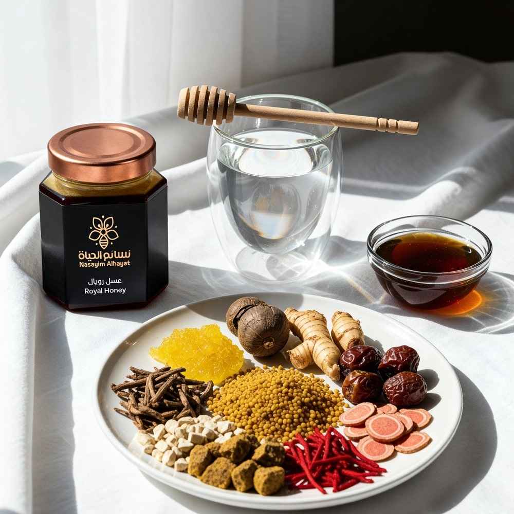 من أشجار السدر النادرة في جبال اليمن والسعودية، ومن أرض الجينسنغ الكوري الاحمر، صُنعت وصفة عسل رويال الملكي لتكون رمزاً للطاقة الملكية.